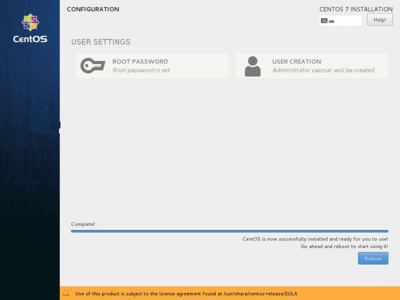 16、 幾分鐘后安裝程序會報告 CentOS 已經成功安裝在你機器中。要使用系統,你只需要移除安裝媒介并重啟機器。