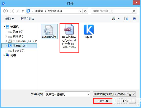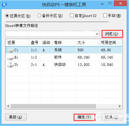 2、進入快啟動win8pe界面后,在系統桌面找到“快啟動一鍵裝機”雙擊打開,然后點擊“瀏覽”選擇U盤啟動盤里的原版win7系統ISO鏡像文件(若U盤啟動盤里存有多個系統鏡像,要注意區分以防裝錯系統),如下圖所示: