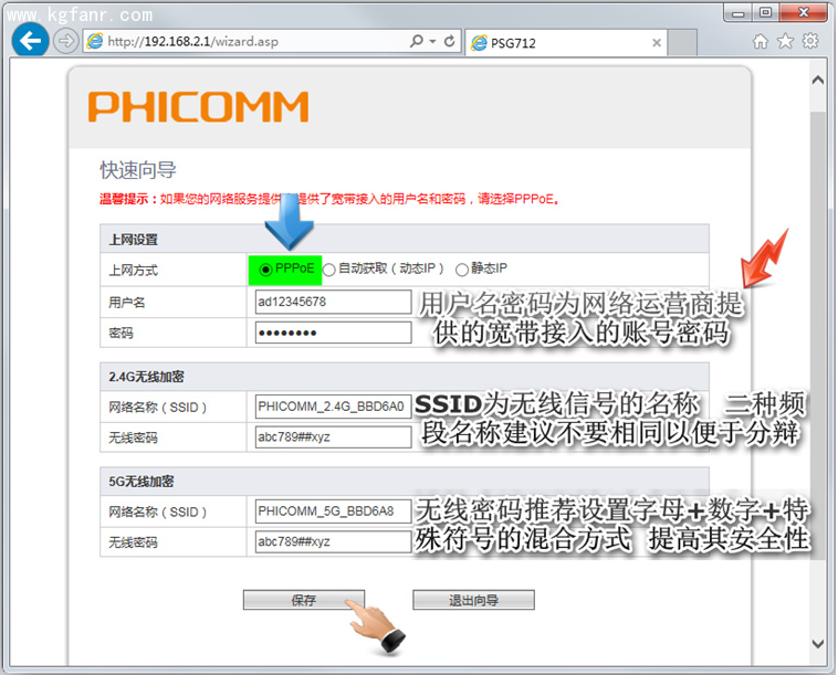 ▲按照圖片文字指示設置好寬帶賬號密碼及無線名稱以及無線密碼