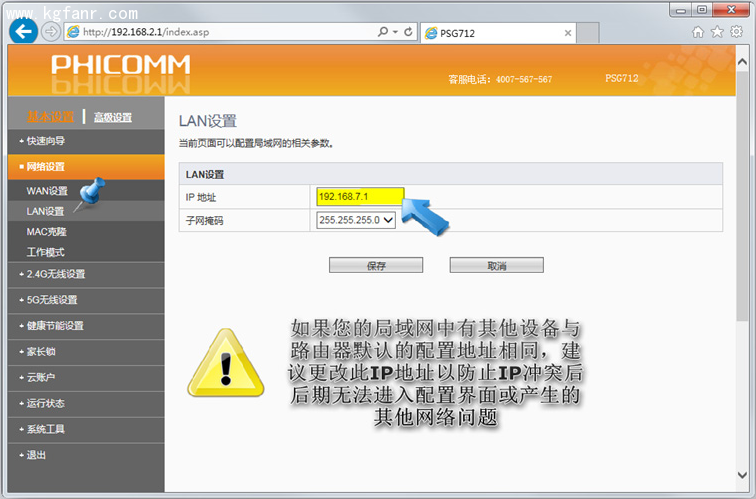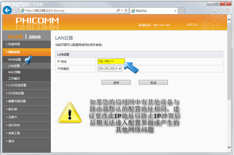 把默認的,92.168.2.1改成192.168.7.1為了避免部分用戶局域內同IP的設備造成沖突。