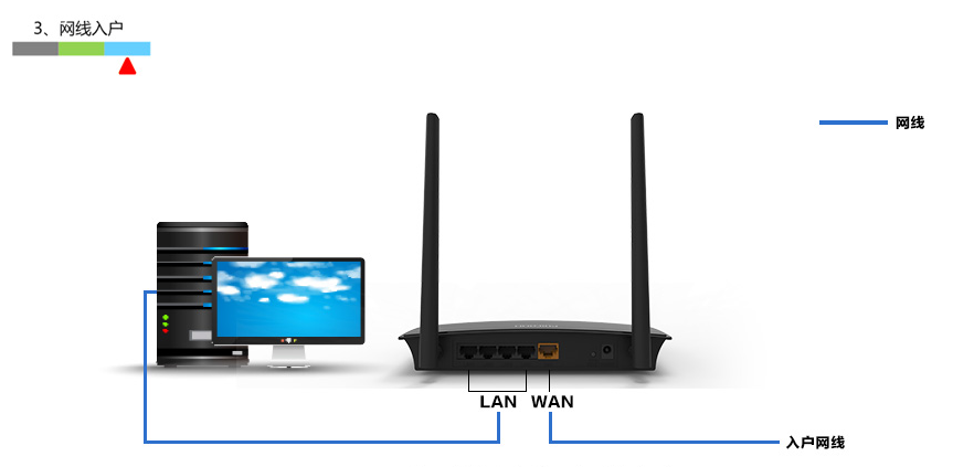 1、首先使用一根網線連接路由器的LAN與電腦的網口(如您電腦目前有網線連接著,請先拔出掉),連線如圖。