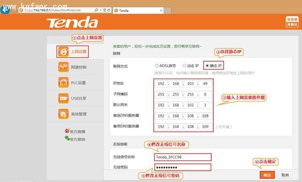 2、點擊“上網設置”,選擇聯網方式為“靜態IP”,輸入IP地址、子網掩碼和網關及DNS地址,點擊“確定”,如下圖: