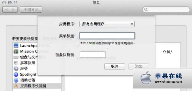 3. 在左側選擇最后一項“應用程序快捷鍵”,點擊右側分配操作區下的“+“按鈕,在彈出框中的第一項選擇應用程序,輸入要分配shortcut的命令項名字,記住,要一字不落,最后在”鍵盤快捷鍵“中賦予它一個獨有的shortcut,用鍵盤操作,右側會出現你按下的快捷鍵(或組合)。