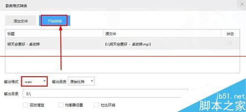 4、這里設置輸出格式為WAV格式,然后設置好輸出文件夾后,點擊開始轉換。