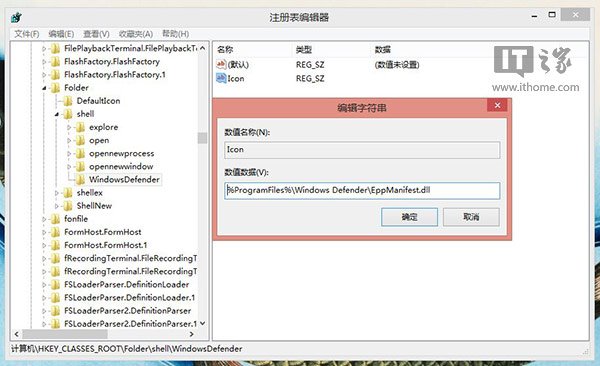 4、雙擊“Icon”字符串進行編輯,數值%ProgramFiles%Windows DefenderEppManifest.dll