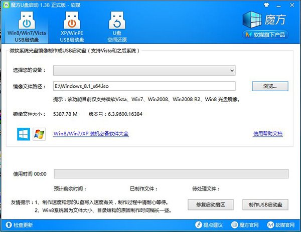 2、制作U盤(pán)啟動(dòng)盤(pán)。這也是目前最流行的系統(tǒng)安裝方式,可以借助魔方U盤(pán)啟動(dòng)(點(diǎn)擊下載最新版),指定大容量U盤(pán),添加Win8鏡像文件,就可以開(kāi)始制作啟動(dòng)盤(pán)。