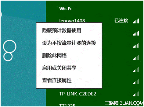 3、右擊選擇已連接好的無(wú)線(xiàn)信號(hào),跳出的選項(xiàng)有 “顯示和隱藏預(yù)計(jì)數(shù)據(jù)使用”“設(shè)為按流量計(jì)費(fèi)的連接”;