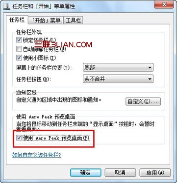 如果電腦中的Win7版本是包含Aero特效的,那也有可能是沒有開啟該功能。用鼠標(biāo)右鍵點(diǎn)擊開始按鈕,選擇屬性,在“任務(wù)欄和開始菜單屬性”中切換到 “任務(wù)欄”選項(xiàng)卡,查看最下方的“使用Aero Peek預(yù)覽桌面”是否被勾選,如果沒有,則將該項(xiàng)選中,然后點(diǎn)擊“確定”按鈕保存設(shè)置。