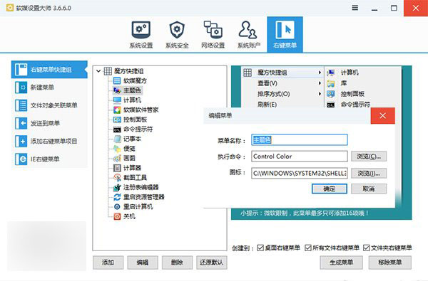如果你覺得上面的打開方法太麻煩,還可以把這個設置添加到右鍵菜單。下載軟媒魔方(點此下載),打開“軟媒設置大師”—“右鍵菜單”—“右鍵菜單快捷組”,在這里添加右鍵菜單。如下圖所示,執行命令填寫Control Color即可。