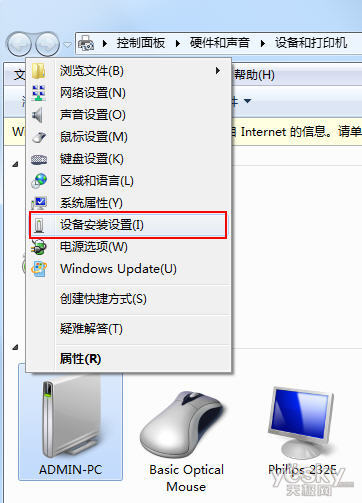 點(diǎn)擊Win7桌面左下角的圓形開(kāi)始按鈕,打開(kāi)“設(shè)備和打印機(jī)”。右鍵點(diǎn)擊PC圖標(biāo),選從右鍵菜單中選擇“設(shè)備安裝設(shè)置”。在彈出來(lái)的“設(shè)備安裝設(shè)置”窗口中選擇“否,讓我選擇...
