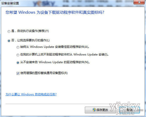 圖示:在Win7“設(shè)備安裝設(shè)置”窗口中設(shè)置自己需要的驅(qū)動(dòng)安裝規(guī)則