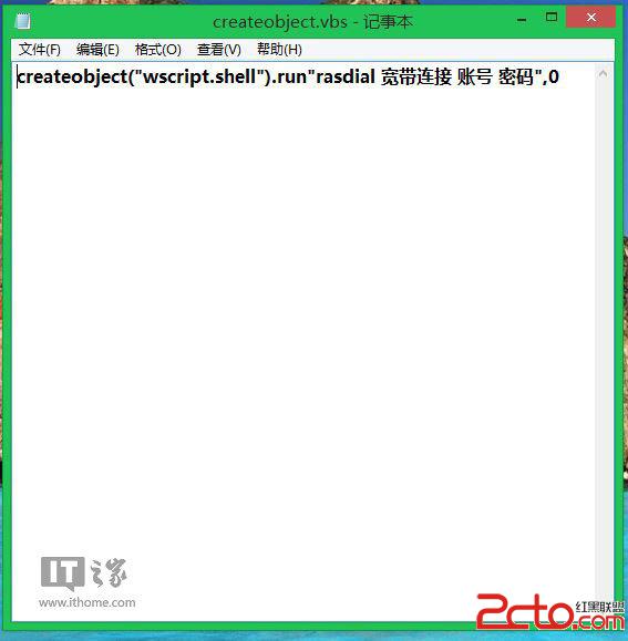 2、繼續新建記事本,輸入(createobject(“wscript.shell”).run”rasdial 寬帶連接 賬號 密碼”,0),另存文件名為createobject.vbs,保存類型為所有文件。
