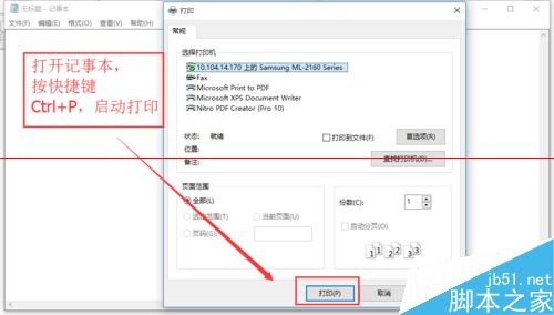 9、秉承不浪費紙張的原則,我們任意打開一個空白的記事本,并點擊菜單欄的“文件”,選擇“打印”,在彈出的對話框中,選中我們剛才添加的打印機。打印機默認列表中,帶有“Document、PDF”字樣的均為虛擬打印機,并不是真實的打印機,大家記住了。