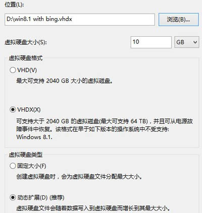 2、首先指定虛擬磁盤位置,例如創建一項win8.1 with bing.VHDX磁盤(優先選擇VHDX格式);至于VHD大小自行決定,因為是32位系統,我們可以選擇10G大小,推薦創建動態擴展;