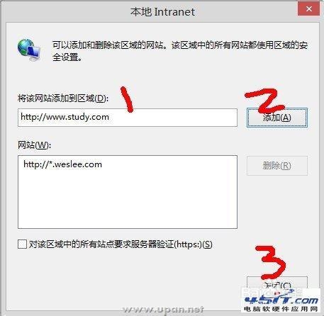 后來嘗試將網址添加到受信任的網址列表中,但是IE仍然無法正常打開此網址。原來在【Internet選項】的【安全】選項卡下,站點那里默認是Internet,而不是本地Internet,所以我們只需要將網址添加到本地Internet網址列表中即可。