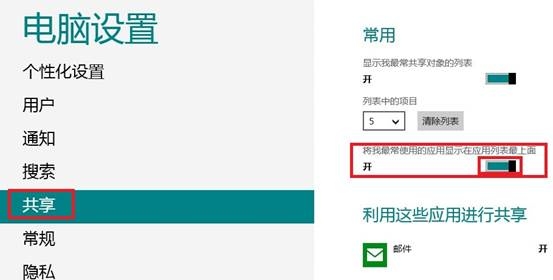 1.鼠標移動屏幕右上角出現“圖一”點擊“設置”; 2.出現“圖二”點擊“更多電腦設置”; 3.出現“圖三”點擊共享,將右邊的“將我最常使用的應...