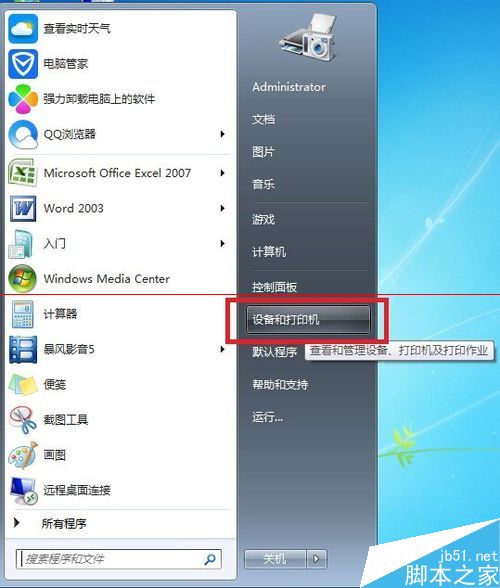 1、點(diǎn)擊開(kāi)始按鈕,打開(kāi)“設(shè)備和打印機(jī)”菜單。