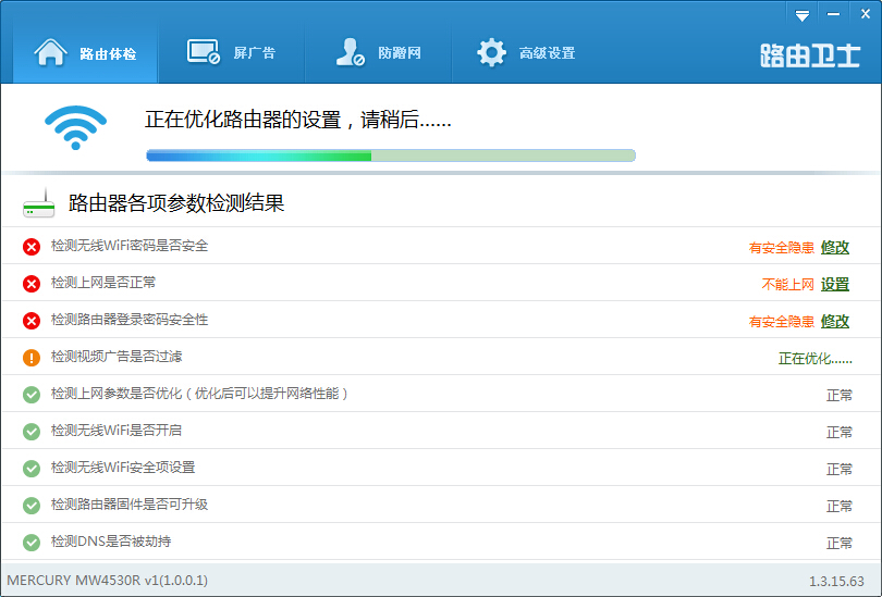 點擊“一鍵優(yōu)化”,可以自動開啟屏廣告功能,優(yōu)化網(wǎng)絡(luò)性能,檢測DNS健康狀況以及路由器是否有新的固件更新來提高路由器的穩(wěn)定性。