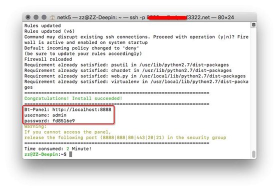 當(dāng)看到該界面時(shí),代表BT面板安裝成功。紅框內(nèi)為初始管理賬戶信息(每個(gè)人生成的不一樣,請(qǐng)不要照搬密碼)