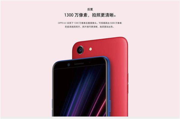 OPPO A1定位入門,采用5.7英寸18:9全面屏,分辨率為720 x 1440,處理器型號還未知,內(nèi)存組合為4GB+64GB,后置1300萬像素攝像頭,前置800萬像素攝像頭,支持AI美顏,內(nèi)置3180mAh電池,手機(jī)還支持刷臉解鎖。