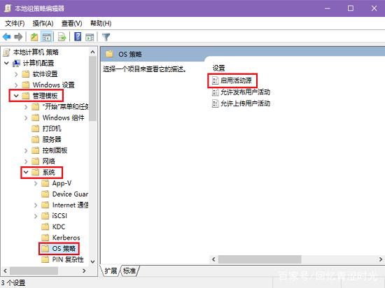 2、在本地組策略編輯器中依次打開“計算機配置”—“管理模板”—“系統”—“OS策略”,然后在右側欄中找到“啟用活動源”。