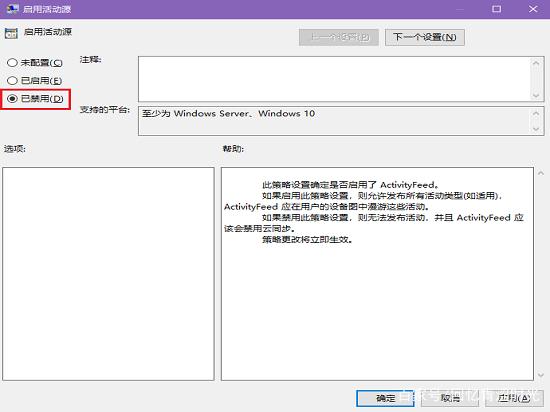 3、雙擊“啟用活動源”項,勾選“已禁用”項,點擊應用和確定。這樣Win10系統的時間軸功能就被關閉了。