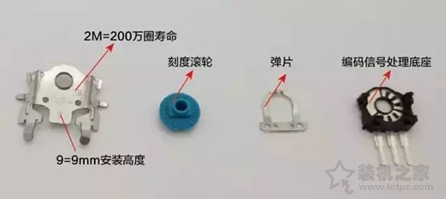 鼠標微動有不同的手感和壽命,滾輪也是一樣。和微動不同的是,滾輪的信號源自編碼器。滾輪編碼器分為機械式和光柵式。