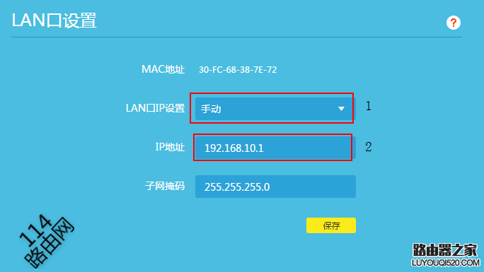 把這里的【自動(dòng)】修改為手動(dòng),并輸入想要設(shè)置的網(wǎng)段,比如192.168.10.1,子網(wǎng)掩碼 255.255.255.0 直接輸入該地址和掩碼保存即完成了TP-link無(wú)線(xiàn)路由器內(nèi)網(wǎng)地址修改的工作。