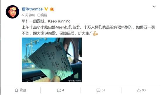 截至5月13日上午7:20,小米路由器Mesh預約量已經高達10萬人。唐沐表示,10萬人預約是我沒有預料到的,如果萬一買不到,跟大家說抱歉,保障品質、擴大生產。