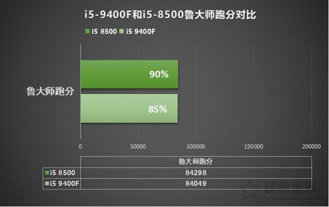 魯大師跑分結(jié)果,i5-9400F跑了84049分,而i5-8500跑了84298分,兩者差了200分左右,i5-8500小勝,不過差距極小,完全可以忽略不計(jì)。