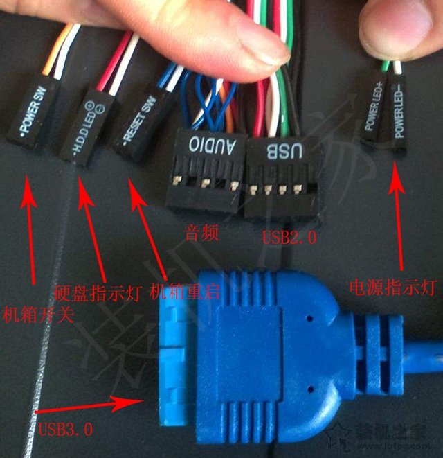 我們首先來認識一下機箱上所有的連接線,POWER_LED是電源指示燈、HDD_LED是硬盤指示燈、POWER SW是開關機按鍵 、RESET SW是重啟按鍵,機箱前置USB3.0接口、AUDIO是機箱前置音頻,機箱前置USB2.0接口等。