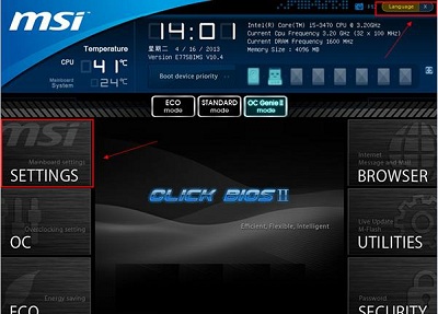 2、在uefi biOS設置界面,首先點擊右上角的語言欄將其設置為中文,然后移動鼠標點擊“SETTINGS”,如下圖所示: