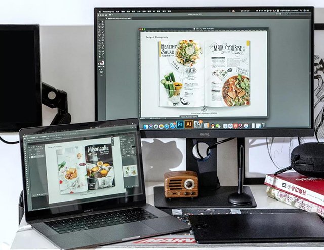 就拿我自己現(xiàn)在使用的是明基 PD2700U顯示器舉個(gè)例子來(lái)說(shuō),它是一款擁有4K(3840×2160)分辨率的27英寸的IPS顯示器,4K的分辨率真的展示出了很多低分辨率無(wú)法實(shí)現(xiàn)的細(xì)節(jié);它在功能上更偏向?qū)I(yè)設(shè)計(jì)。前面我也提過(guò)設(shè)計(jì)師對(duì)色彩的要求非常高,那這款顯示器作為專業(yè)設(shè)計(jì)屛在色彩的表現(xiàn)上非常不錯(cuò),提供了99%的sRGB色域、10bit(8抖10)色深和出廠校色,sRGB的色域?qū)τ谶M(jìn)行網(wǎng)絡(luò)傳播而非印刷輸出的設(shè)計(jì)作品完全是足夠的,再加上色彩的過(guò)渡和還原度表現(xiàn),還是非常值得入手的。這款顯示器還支持HDR顯示,外觀設(shè)計(jì)上十分簡(jiǎn)潔明朗穩(wěn)重,偏向商務(wù),三面窄邊設(shè)計(jì),如果有同型號(hào)雙屏拼接,那么超窄邊框會(huì)讓拼接之后的畫面連續(xù)性更強(qiáng),值得一提的是,這款顯示器自帶DP-OUT功能,可以輕松完成雙屏拼接。