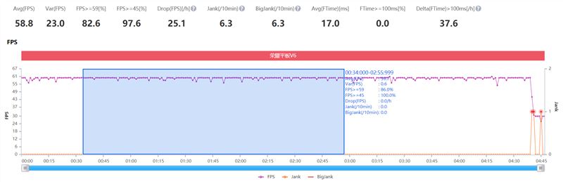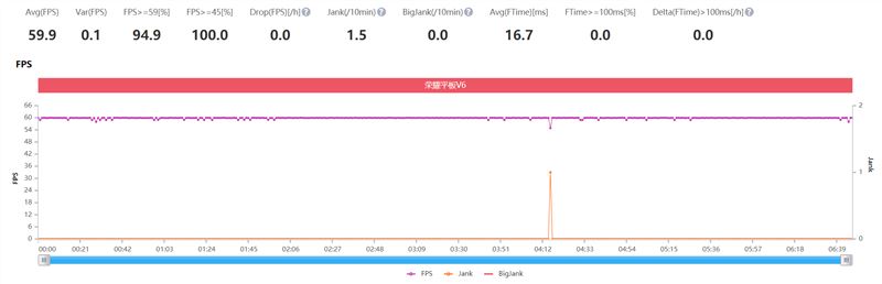 平均幀率為59.9FPS,F(xiàn)PS大于59的時間占游戲全程94.9%,全程發(fā)生卡頓僅有1次,無嚴重卡頓。