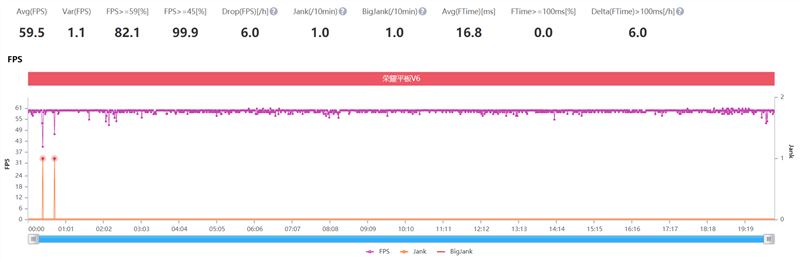 由于《王牌戰(zhàn)士》會在角色等待復活時自動調(diào)低幀率,所以截取中間穩(wěn)定游戲過程的幀率進行統(tǒng)計。平均幀率59.7FPS,游戲過程中無卡頓,幀數(shù)略有波動,有14%的時間幀率降到了59FPS以下。