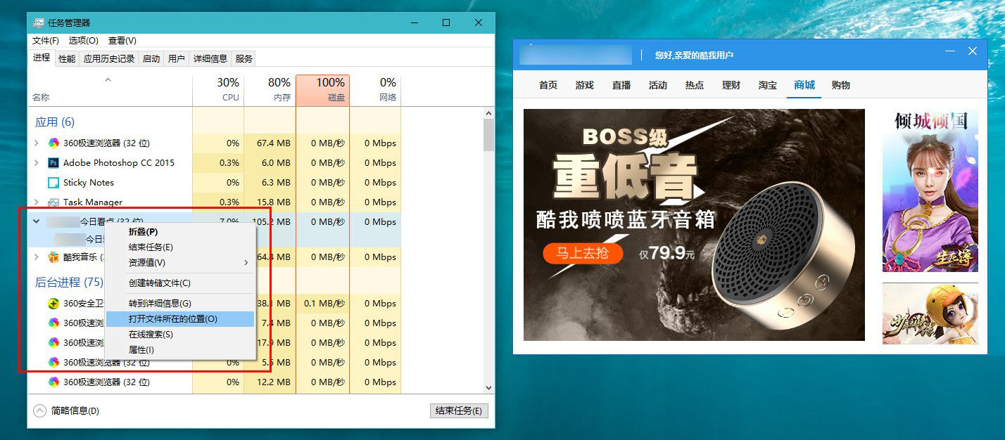 1、這種彈窗程序還算是比較老實(shí)巴交的,會誠實(shí)的告訴你它的名字。我們打開任務(wù)管理器,找到對應(yīng)彈窗程序名字的進(jìn)程,然后右擊選擇“打開文件所在的位置”,這樣我們就定位到了彈窗軟件。
