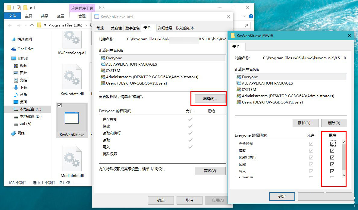 4、右擊改過名字的文件,選擇屬性-安全,在安全選項(xiàng)下選擇編輯,然后在彈出的窗口的拒絕一欄全部勾選上,然后點(diǎn)擊確定,系統(tǒng)會提示是否更改權(quán)限,點(diǎn)擊確定就可以了。