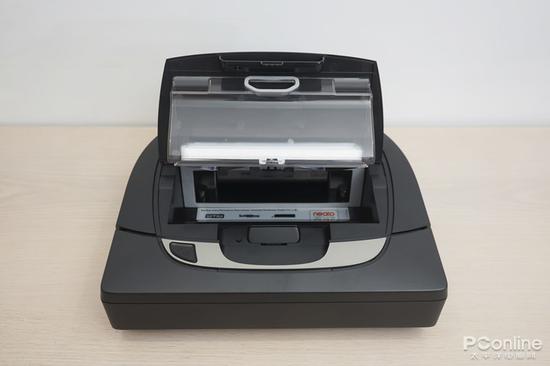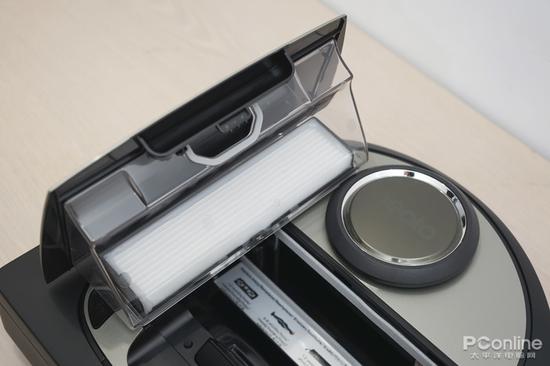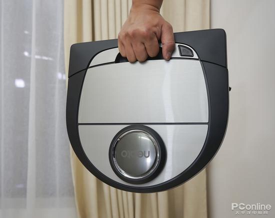 頂部只有一個按鈕,兼具了電源、啟動和對接的功能。頭部有一個凹槽,是揭開集塵盒的入口,同時還有一個非常人性化的功能,可以作為手提的把手。掃地機(jī)再也不用“抱著”了,可以很輕松的單手拎起來,非常巧妙便利的設(shè)計。