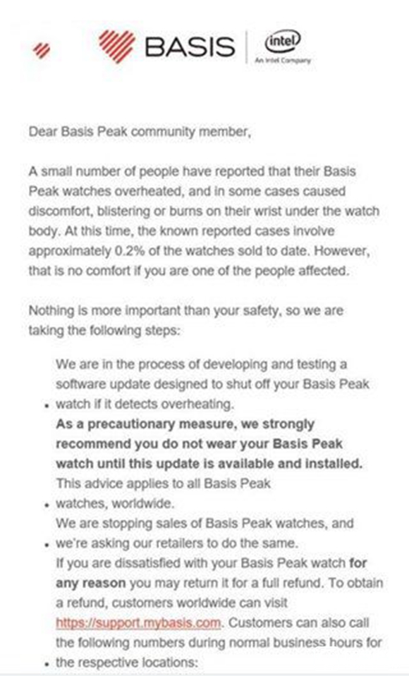 Basis Peak智能手表是英特爾在2014年發(fā)布的智能穿戴產(chǎn)品,這款產(chǎn)品能夠追蹤用戶的運(yùn)動(dòng)情況,自發(fā)布以來,英特爾不斷為其提供更新,添加了諸多新功能。英特爾今天向Basis Peak智能手表用戶發(fā)出了警告郵件,稱其有0.2%的Basis Peak出現(xiàn)了過熱的問題,雖然占比不多,然而為了用戶的安全考慮,Basis Peak智能手表將暫停發(fā)售,直到修復(fù)版產(chǎn)品發(fā)貨。英特爾稱該公司正在著手處理這一問題,將在近日發(fā)布軟件更新,同時(shí)客戶如果退貨可以獲得全額退款。