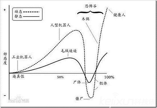 這段不能被認(rèn)同的領(lǐng)域被稱作恐怖峽谷,針對這一現(xiàn)象,日本機(jī)器人專家森昌弘提出一個關(guān)于人類對機(jī)器人和其他物體感覺的假設(shè)理論,叫做“恐怖谷理論”。他認(rèn)為,人形玩具或機(jī)器人的仿真度越高人們越有好感,但當(dāng)達(dá)到一個臨界點(diǎn)時,這種好感度會突然降低,越像人越反感恐懼,直至谷底,稱之為恐怖谷。