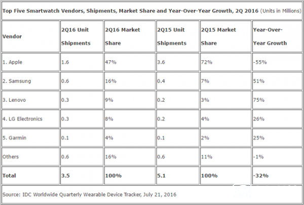 2016年第二季度全球智能手表銷量和市場份額,數據來自IDC
