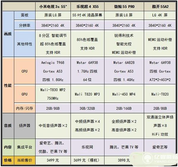 對(duì)于互聯(lián)網(wǎng)電視而言,評(píng)價(jià)標(biāo)準(zhǔn)不外乎是畫質(zhì)、硬件性能、音質(zhì)以及系統(tǒng)內(nèi)容等幾個(gè)方面。小編選取了樂視、微鯨和酷開這三個(gè)品牌的55英寸平板電視的最新產(chǎn)品,并將它們與小米電視3s 55英寸做個(gè)簡(jiǎn)要的對(duì)比介紹??梢钥吹?,也許在某一方面小米電視3s 55英寸的表現(xiàn)并不是最好的,但就綜合實(shí)力而言,小米電視3s 55英寸還是那款最值得買的。