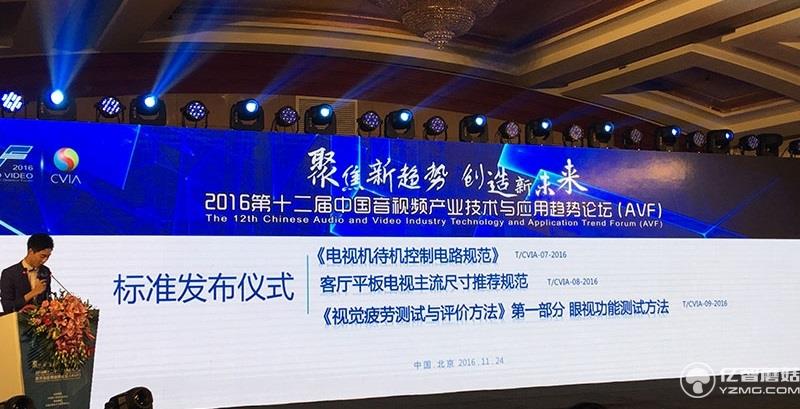 11月24日,由中國電子視像行業協會主辦“2016(第十二屆)中國音視頻產業技術與應用趨勢論壇(AVF)”在北京召開,為了推動企業提升技術水平和效率,規范行業競爭、綠色節能減排,在本屆AVF論壇上,中國電子視像行業協會聯合TCL、創維、海信、海爾、康佳、長虹、京東方、樂金電子、三星、樂視、聚力、華星光電、熊貓、3M、奧維云網、中國標準化研究院、溫州醫科大學附屬眼視光醫院、中國科學院軟件所、顯示與視覺健康創新聯盟、北京理工大學、四川大學、東南大學、正星光電、華南師大、中彩聯、深圳市智能電視產業標準聯盟等企業和單位,共同制定并發布了《電視機待機控制電路規范》、《客廳平板電視主流尺寸推薦規范》、《顯示終端視覺疲勞測試與評價方法》第1部分 眼視功能測試方法。
