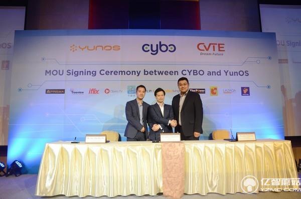 YunOS運營部總經(jīng)理肖睿哲、Cybo總經(jīng)理Sittikorn Chitpedakorn、CVTE COO王洋出席發(fā)布會并在現(xiàn)場進行MOU簽約儀式