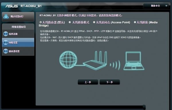 固件方面,第一次配置路由的話會有設置向導,其中一步可以看到路由器支持4種工作模式,路由模式和AP模式是大家比較熟悉的,無線橋接的話可以實現“萬能中繼”,這個功能是比較實用的。