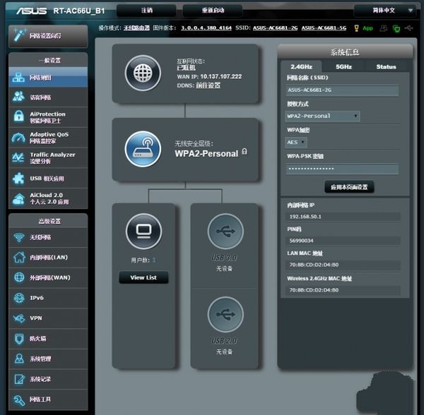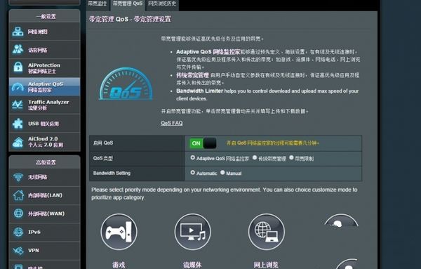 管理界面還是華碩傳統的深灰色界面,但是在左區功能菜單和其他華碩路由基本一致,不過少了華碩路由如RT-AC5300搭載的的Game Boost游戲加速功能。由于固件設置內容較多,我們挑幾個特別的設置和功能說說,常規設置就略過。