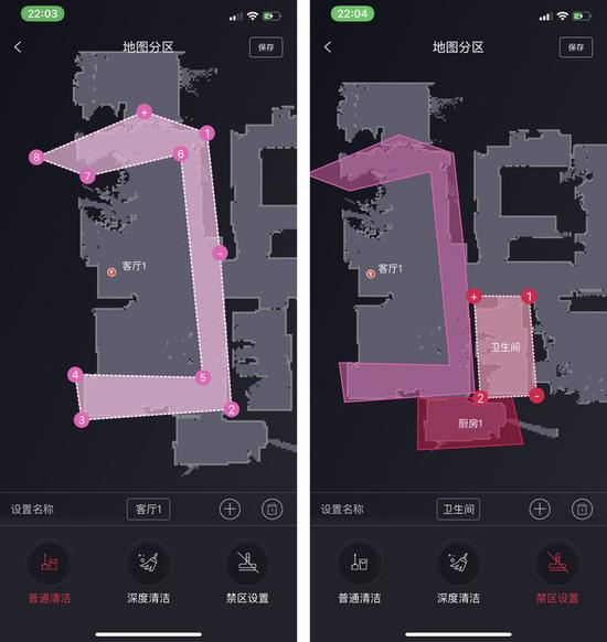 打個(gè)比方,這幾天我就在手機(jī)端將一些積灰較多的墻角劃分為好幾個(gè)小區(qū)域,由于支持 10 點(diǎn)自定義,所以可以只畫(huà)沿墻的部分而不用覆蓋其它區(qū)域,至于像衛(wèi)生間和陽(yáng)臺(tái)等則可以設(shè)為禁區(qū),這樣就算是沒(méi)人在家忘了關(guān)戶內(nèi)門(mén),也不用擔(dān)心 R55 Cyclone 進(jìn)入是非之地了。