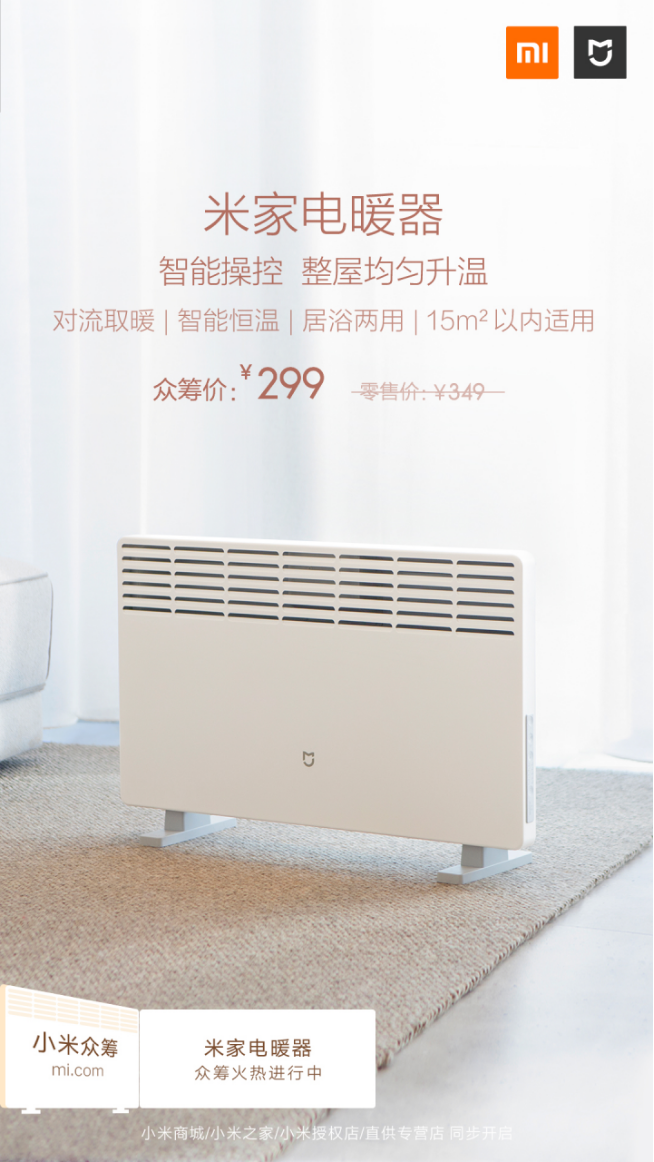米家電暖器目前火熱眾籌中,眾籌價僅需299元,除了線上眾籌渠道外,線下小米之家、小米授權(quán)店、直供專營店同步開啟,到店參與立享眾籌價。