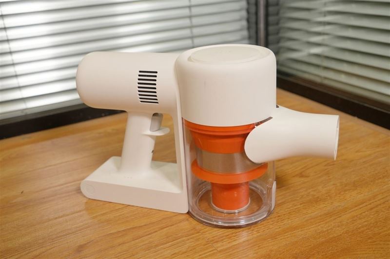 先來看主機,紅白配色相當令人熟悉,也是米家凈化器、米家掃地機器人等小米系小家電常常出現(xiàn)的風格。它采用的是槍式手柄和扳機式開關(guān)設(shè)計,方便在舉臂清理墻壁、窗簾和天花板的時候讓機器重心更靠近手臂。