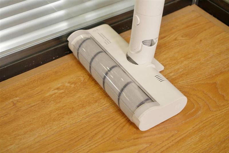 米家無線吸塵器K10的地刷支持吸拖一體,所以可搭載水箱抹布使用。值得一提的是,其滾刷蓋板是透明的,內部情況一目了然。地刷當中還有灰塵傳感器,當主機選擇標準模式時,就會開啟工作,根據不同區域的積塵情況自動調整吸力。